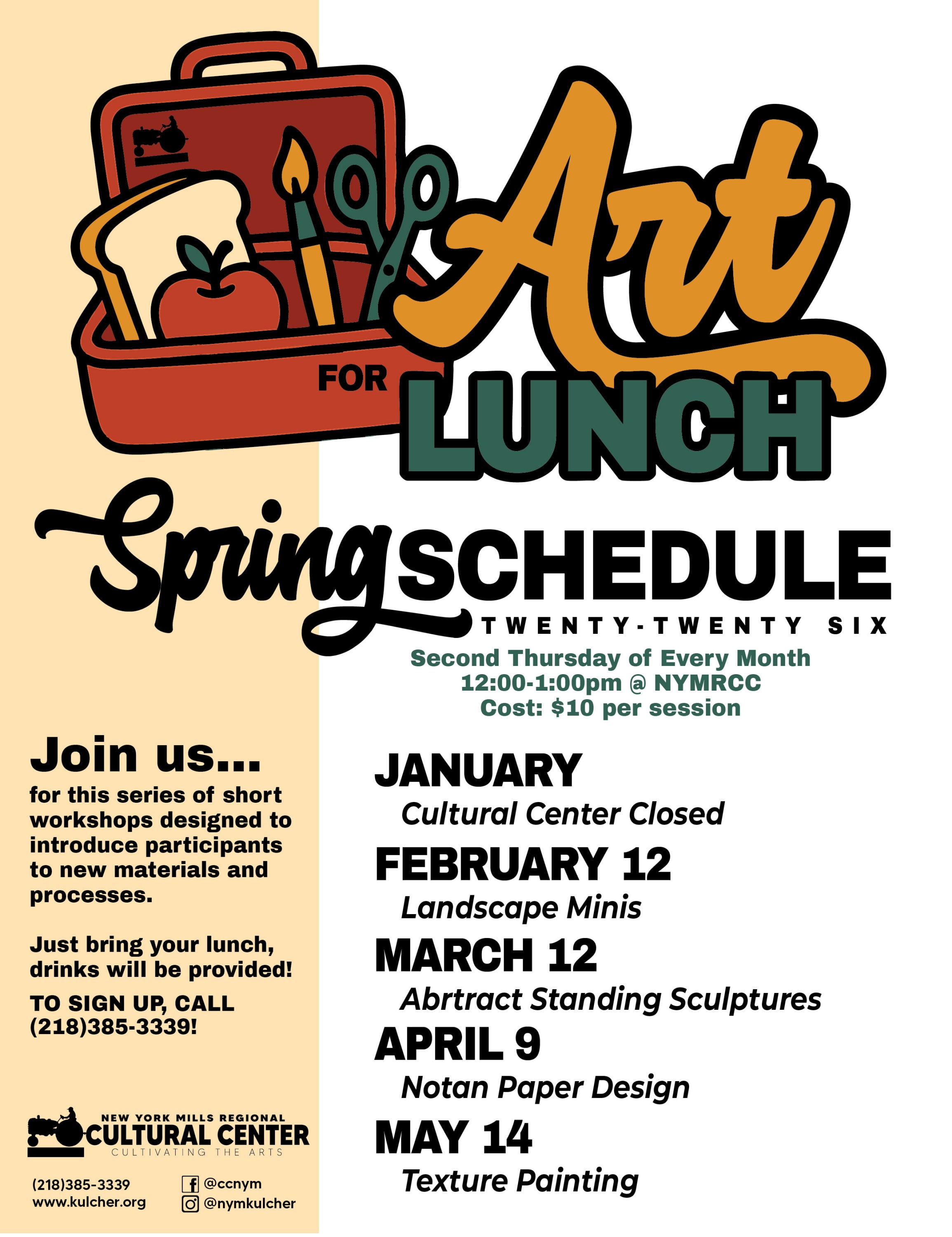 Art for lunch takes place on the second Thursday of the month. $10 per person. Call the Center at 218-385-3339 to sign up. Workshops take place in the upstairs studio, accessible only by stairs. If accommodations are needed, please call 218-385-3339.