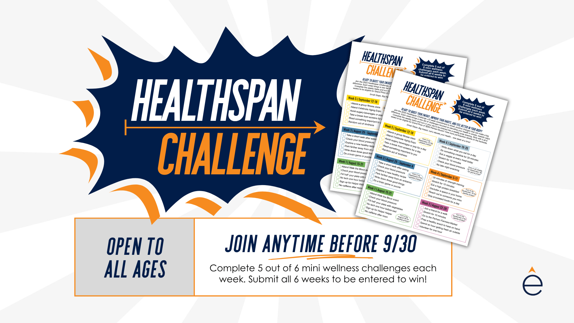 The Healthspan Challenge is a 6-week community wellness challenge focused on helping you build healthier habits through small, weekly actions. Each week, you’ll complete simple challenges designed to support your physical, mental, or social well-being.